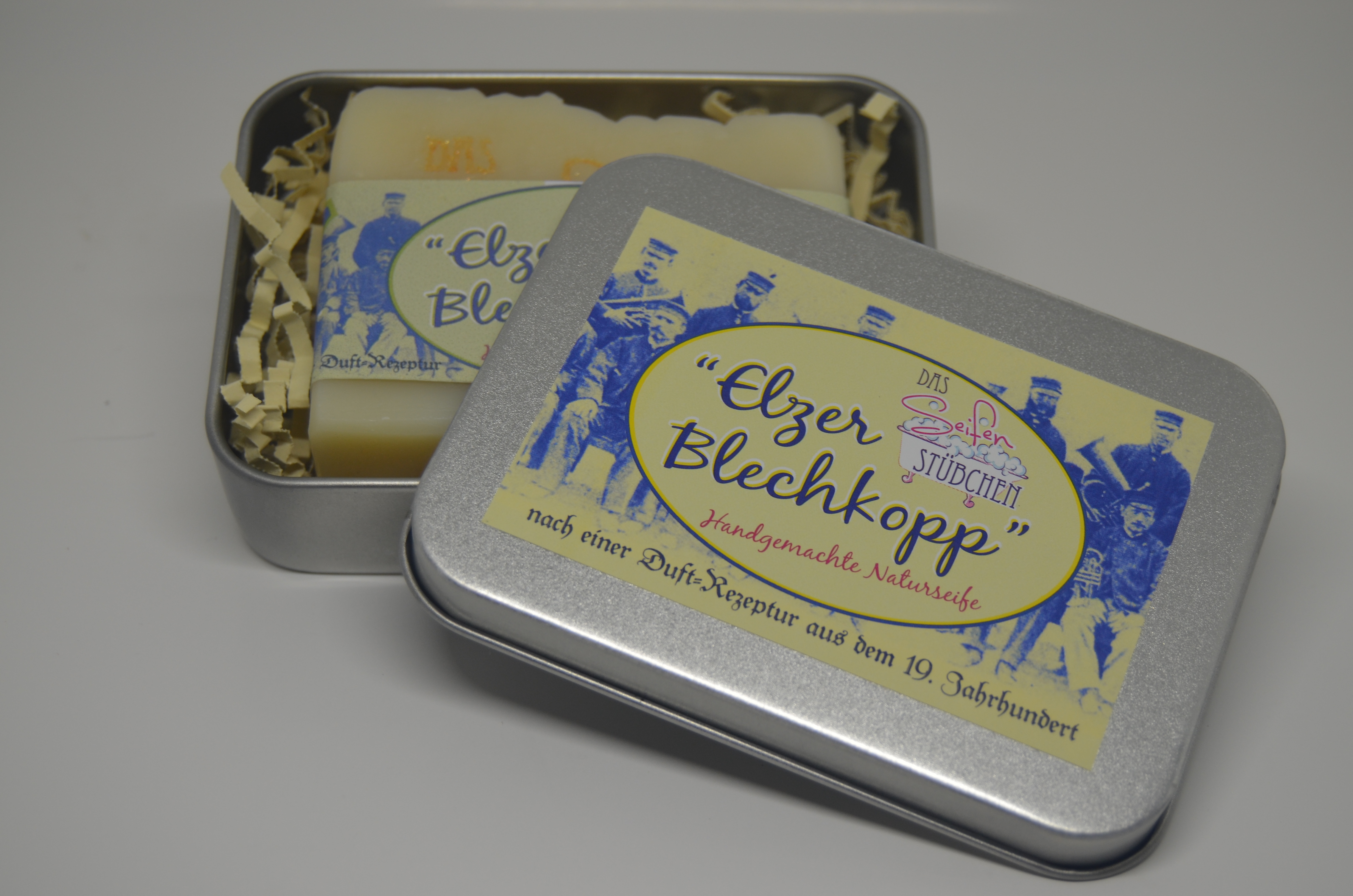 Stilecht in einer Blechdose verpackt kommt die "Elzer Blechkopp"-Seife zu Ihnen.